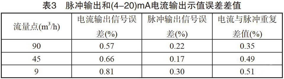 由表3得出,在90m3/h、45m3/h、9m3/h三個流量點下脈沖輸出和(4~20)mA電流輸出方式不同對流量計的所體現的誤差也不一樣。可以看到此次試驗電流信號輸出要比脈沖輸出誤差要偏大0.3%以上。